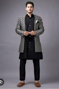 blazer for men lowest price This men’s ethnic printed blazer is designed to deliver a perfect balance of tradition and modern style. The charcoal grey base is enhanced with subtle geometric patterns that give the blazer a refined and premium appearance. blazer for men lowest price The design is elegant, not flashy, making it suitable for men who prefer classy ethnic wear with understated detailing. Whether worn during the day or evening, this blazer maintains a rich and graceful look.
