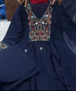 The Statement Dupatta The real “showstopper” of this set is the dupatta that matches the outfit and is made of sheer fabric. It acts as a border for the whole outfit and is adorned with a heavy, continuous border of round mirror-work patches. Each mirror is enshrined in delicate gold thread embroidery that reflects the light magnificently and adds a royal touch to the simple base. The dupatta worn over the shoulder or styled in a classic U-shape or any other way, adds a touch of luxury and grace that makes the set perfect for the most elegant occasions black anarkali.