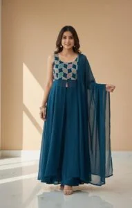 This garment’s core is made from its luxurious georgette fabric, which is extremely light and has a beautiful drape. The Anarkali kurta has a long, flowing silhouette that creates graceful movement as you walk. The kurta is sleeveless to maintain a clean and modern aesthetic that not only highlights the shoulders but also serves as a base for the elaborate mirror-work on the neckline.