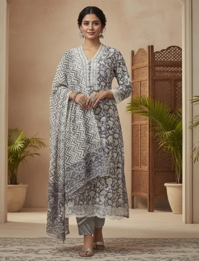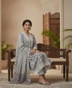 Easy to maintain and suitable for regular use, this kurta set retains its color and print quality with proper care. Whether styled traditionally or with a modern touch, this grey and white kurta set remains a versatile and essential addition to every woman’s ethnic wardrobe indian ladies kurta.